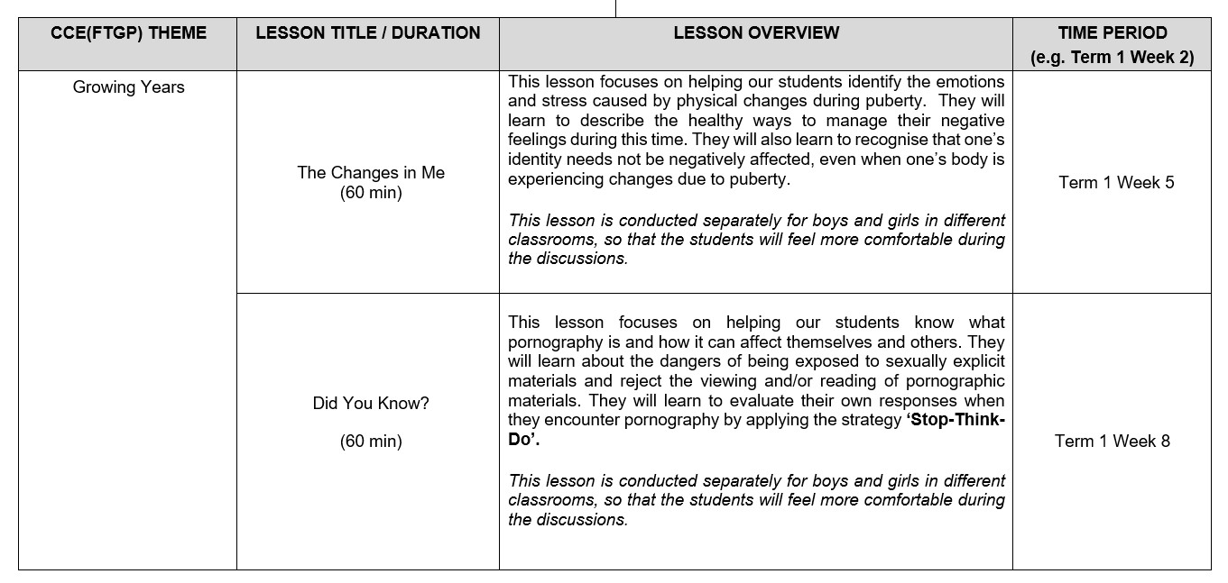 6. The upper primary years mark the onset of puberty. With better nutrition and improved health care, our students are reaching puberty at a younger age and have to grapple with physical, emotional and psychological changes in themselves. The implication is that our students are becoming biologically ready for sexual activity sooner without necessarily having the corresponding cognitive or emotional maturity to modulate their behaviours. Furthermore, our students may also exposed to a wide range of influences that could endanger their health and undermine the integrity of the family. Our students require close guidance so that they can respond with discernment to the sexual messages in the media and other sources.